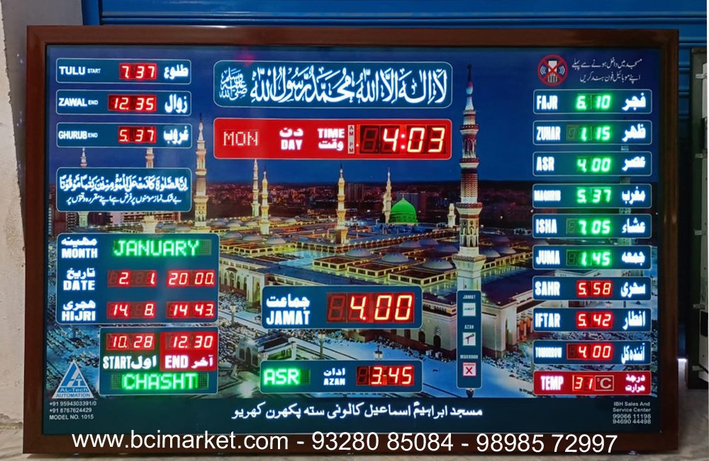 Current event is one of the most important features of this unit. It shows Awaal (start) time and Aakhir (end) time of each event. It shows complete 24 – hours cycle viz. Fajr, Tulu, Isharaq, Chasht, Zawal, Zuhar, Asr, Maghrib, Isha, Tahajjud, Englsih (Date, Month, Year) – Hijri (Date, Month, Year) – Day . First it shows start and end times of FAJR. The moment Fajr time is over, it automatically shows start and end time of Tulu. After Tulu time is over it shows Ishraq, then Chasht and so on. It shows duration of each event as it occurs.