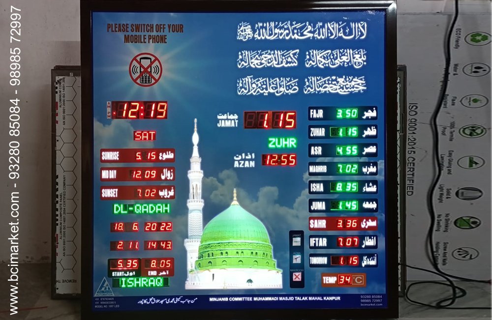 AZAN Time : The unit has reminder for Muazzin to give Azan on time. When Azan is due, it reminds the muazzin by flashing the Green indicator with sign. Flashing continues for one minute. It also gives a beep for 1second. To set Azan times, first of all you will have to decide the interval between Azan and Jamaat of each prayer. Then enter these intervals in unit. As Jamaat time changes, the Azan time will be adjusted automatically using these intervals.