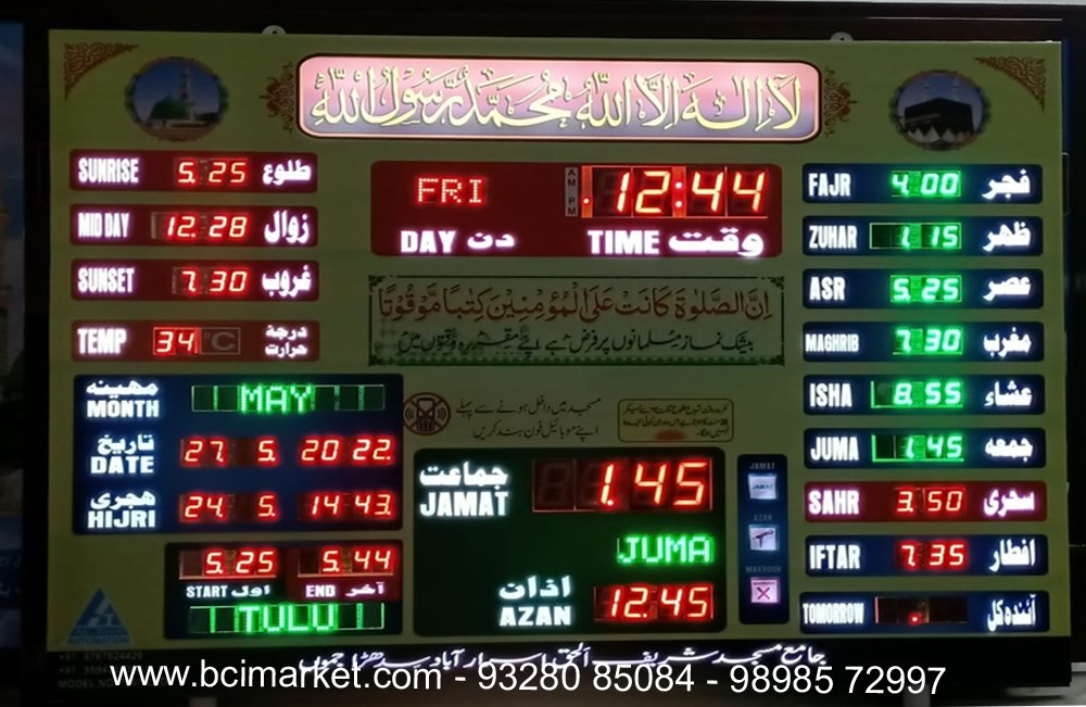 Current event is one of the most important features of this unit. It shows Awaal (start) time and Aakhir (end) time of each event. It shows complete 24 – hours cycle viz. Fajr, Tulu, Isharaq, Chasht, Zawal, Zuhar, Asr, Maghrib, Isha, Tahajjud, Englsih (Date, Month, Year) – Hijri (Date, Month, Year) – Day . First it shows start and end times of FAJR. The moment Fajr time is over, it automatically shows start and end time of Tulu. After Tulu time is over it shows Ishraq, then Chasht and so on. It shows duration of each event as it occurs.